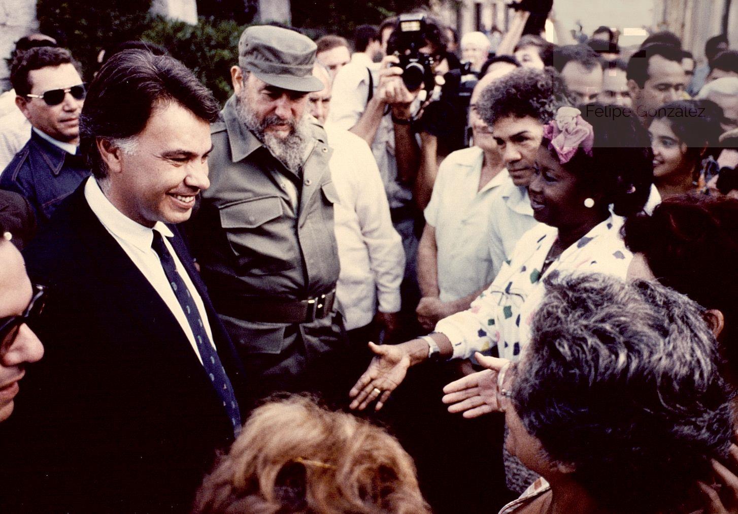 En noviembre de 1986, el presidente del Gobierno español, Felipe González, realiza una visita oficial a Cuba en respuesta a una invitación de Fidel Castro. Gran parte del viaje transcurre en Cayo Piedra, el islote privado del líder cubano, donde González se aloja junto a los escritores Gabriel García Márquez y Alfredo Bryce Echenique, además del propio Castro. La fotografía captura un momento concreto de un acto oficial en el que ambos mandatarios pasean por La Habana Vieja, saludando a los ciudadanos que se congregan a su paso.