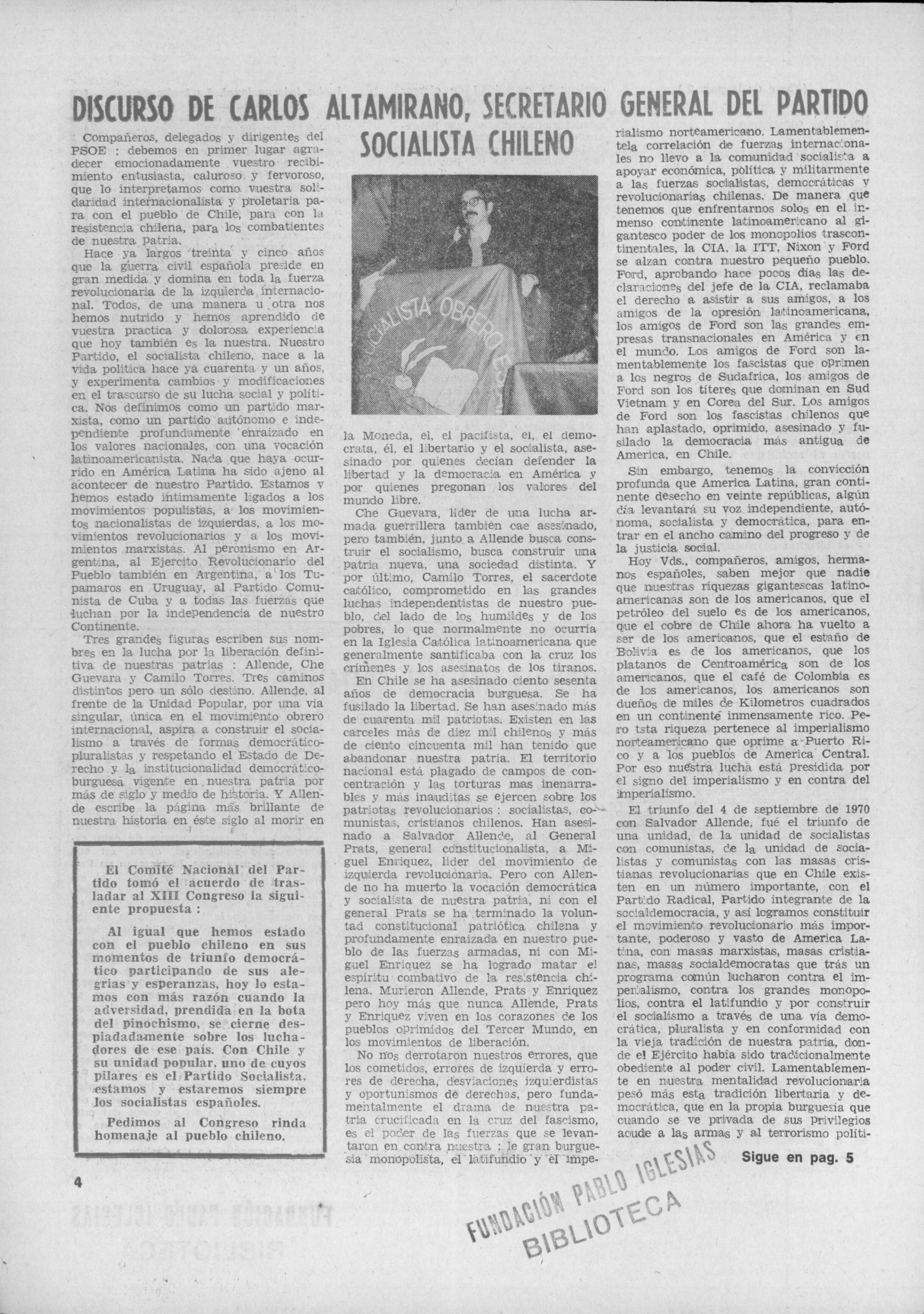 La intervención de Carlos Altamirano en el Congreso de Suresnes, recogida en El Socialista, es una analogía entre España y Chile, una muestra de admiración y agradecimiento. El secretario general expone la situación del socialismo chileno, denuncia la violencia ejercida por la democracia burguesa y defiende la autonomía tanto de Chile como de Latinoamérica.