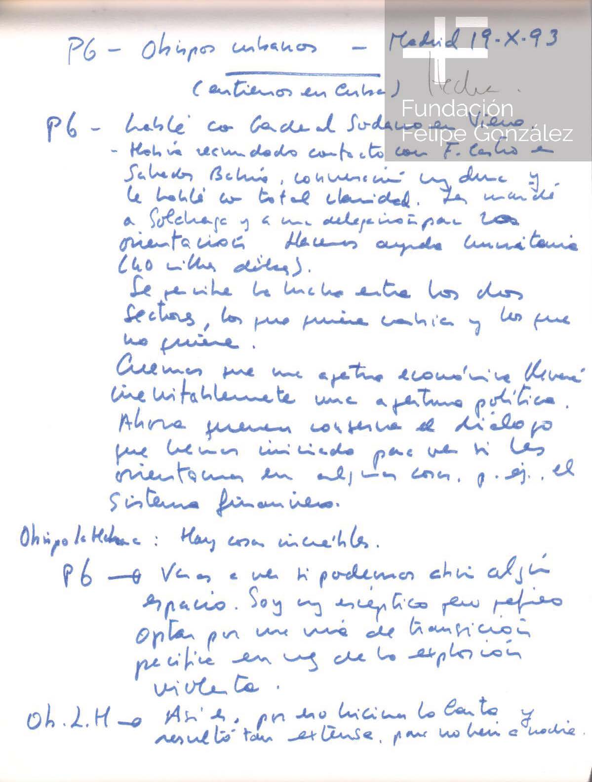 El presidente español conversa con los arzobispos cubanos sobre la situación del régimen de Fidel Castro, al que los clérigos se oponen, así como sobre el margen de actuación de España, que ofrece su ayuda para ayudar al pueblo cubano, que “no tiene por qué pasar por lo que tiene”. La disolución de la Unión Soviética en 1991 se traduce en la pérdida de subsidios y acuerdos comerciales preferenciales para Cuba, lo que la induce en una profunda crisis que provoca restricciones severas y escasez de bienes.