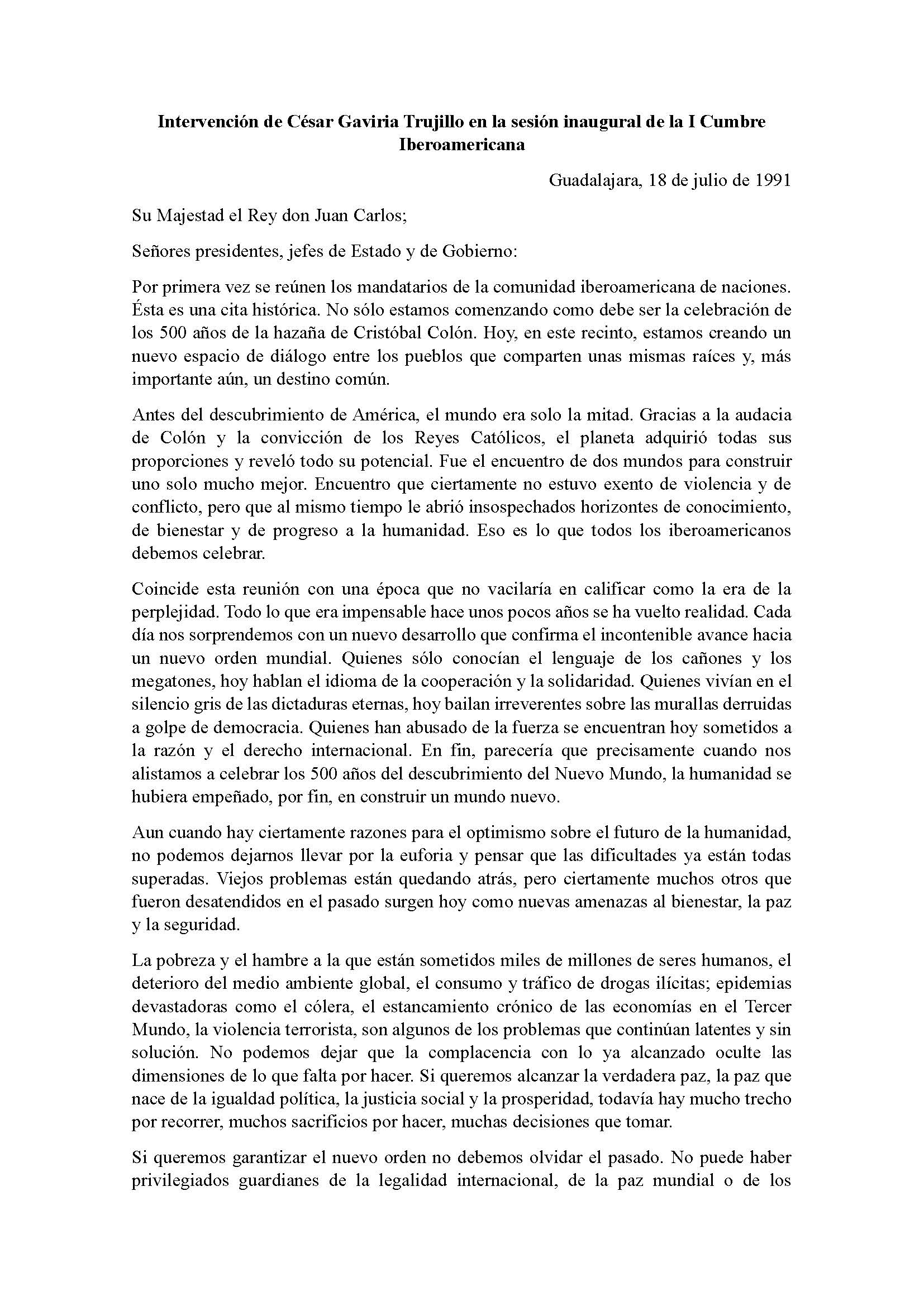 Discurso de César Gaviria, presidente de Colombia entre 1990 y 1994, en la I Cumbre Iberoamericana de 1991