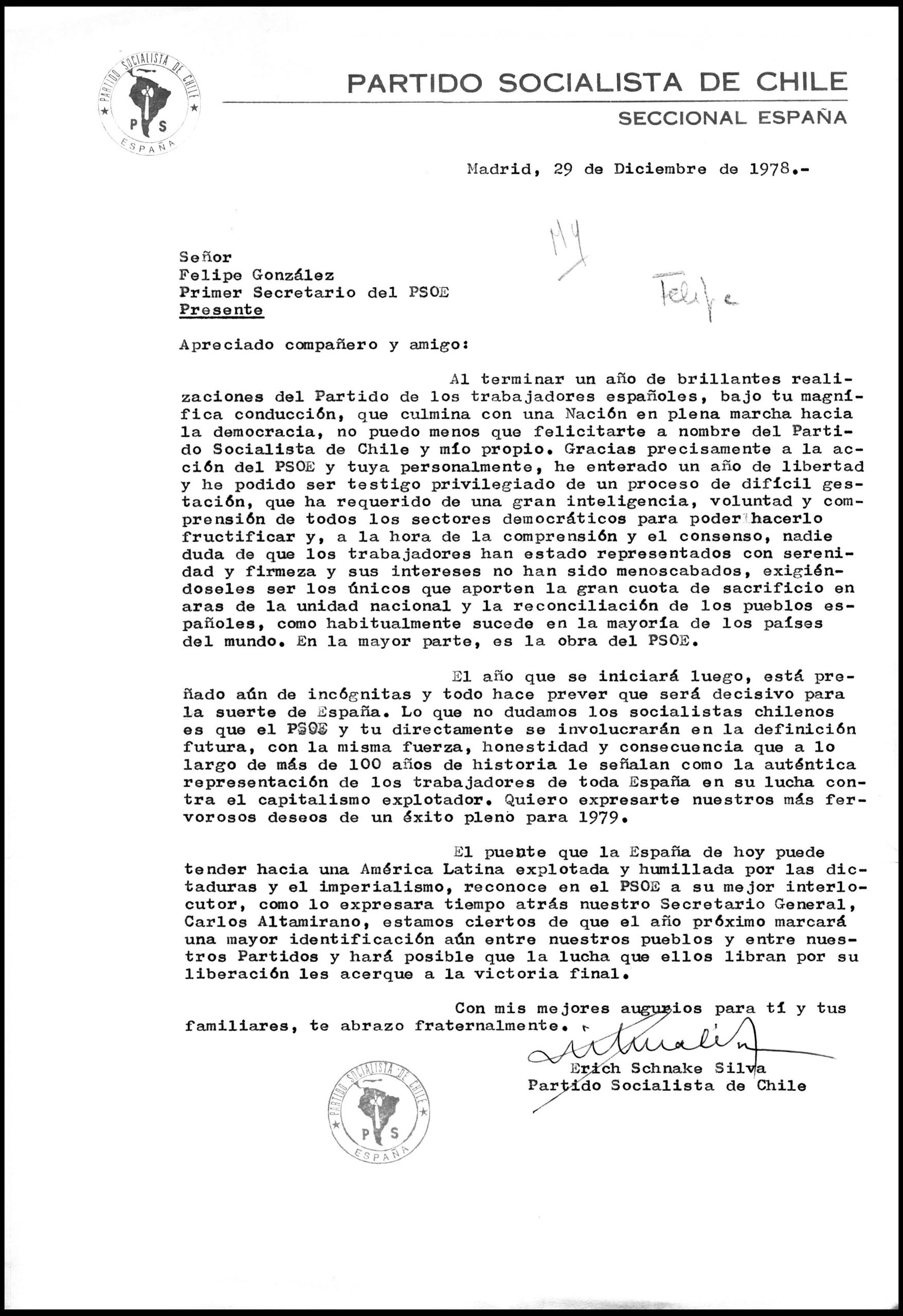 Erich Schnake Silva, abogado y miembro del Partido Socialista de Chile, escribe a Felipe González para expresar su gratitud por el papel desarrollado por el PSOE en la Transición bajo la “magnífica conducción” de su secretario general. La carta está fechada el mismo día que la Constitución española entra en vigor, el 29 de diciembre de 1978.