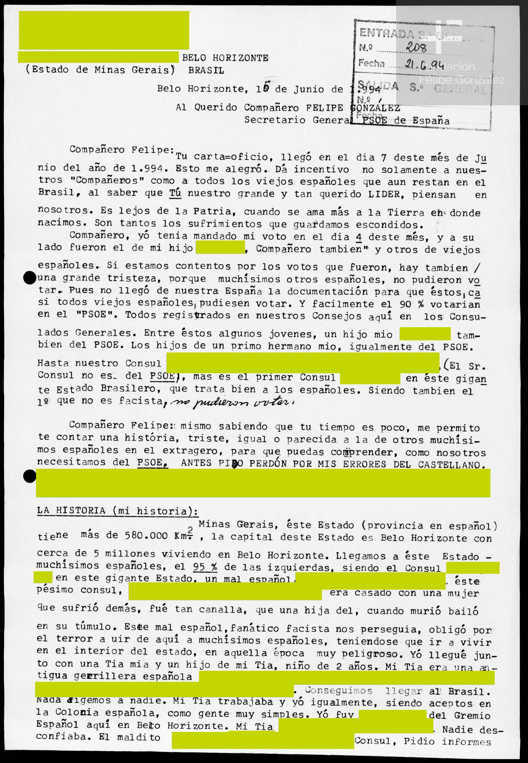 El 12 de junio de 1994 se celebran las elecciones al Parlamento Europeo en España, de forma simultánea a las elecciones al Parlamento de Andalucía. Un ciudadano español de 67 años residente en Brasil se dirige a Felipe González para informar de que había enviado su voto y para contarle su historia, no sin antes agradecer que piense en los emigrantes. Expresa tanto la alegría como la tristeza que le produce, y escribe que “es lejos de la patria, cuando se ama más a la tierra en donde nacimos. Son tantos los sufrimientos que guardamos escondidos”.