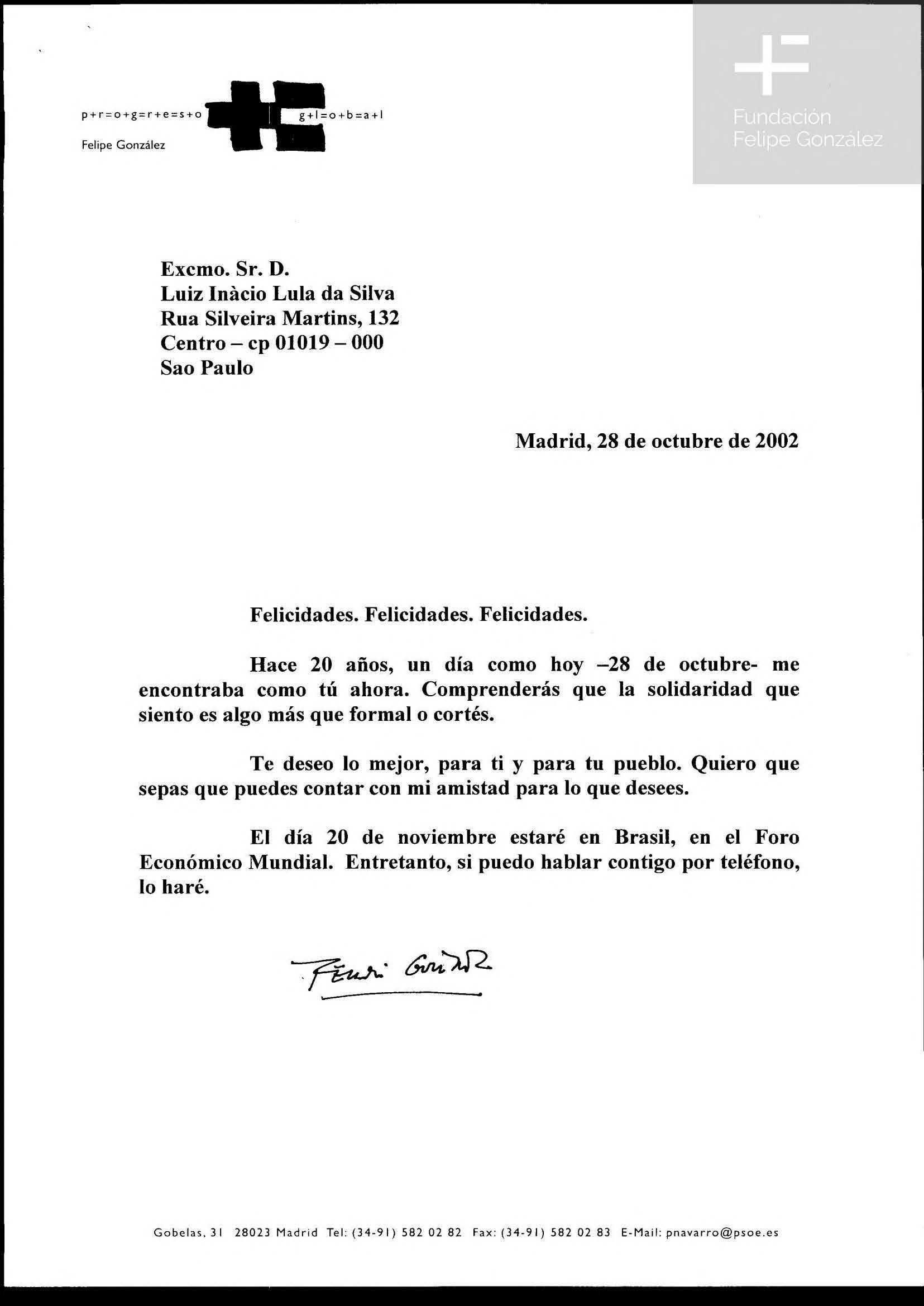 El 28 de octubre de 2002, Felipe González escribe al recién electo presidente de Brasil, Luiz Inácio Lula da Silva. La fecha no es casual: exactamente 20 años antes, el 28 de octubre de 1982, el PSOE de Felipe González había logrado la victoria en las elecciones generales. Esta coincidencia, junto con la estrecha relación entre ambos, impulsa a González a enviar una carta cargada de entusiasmo, en la que la alegría desborda el papel: “Felicidades. Felicidades. Felicidades.”