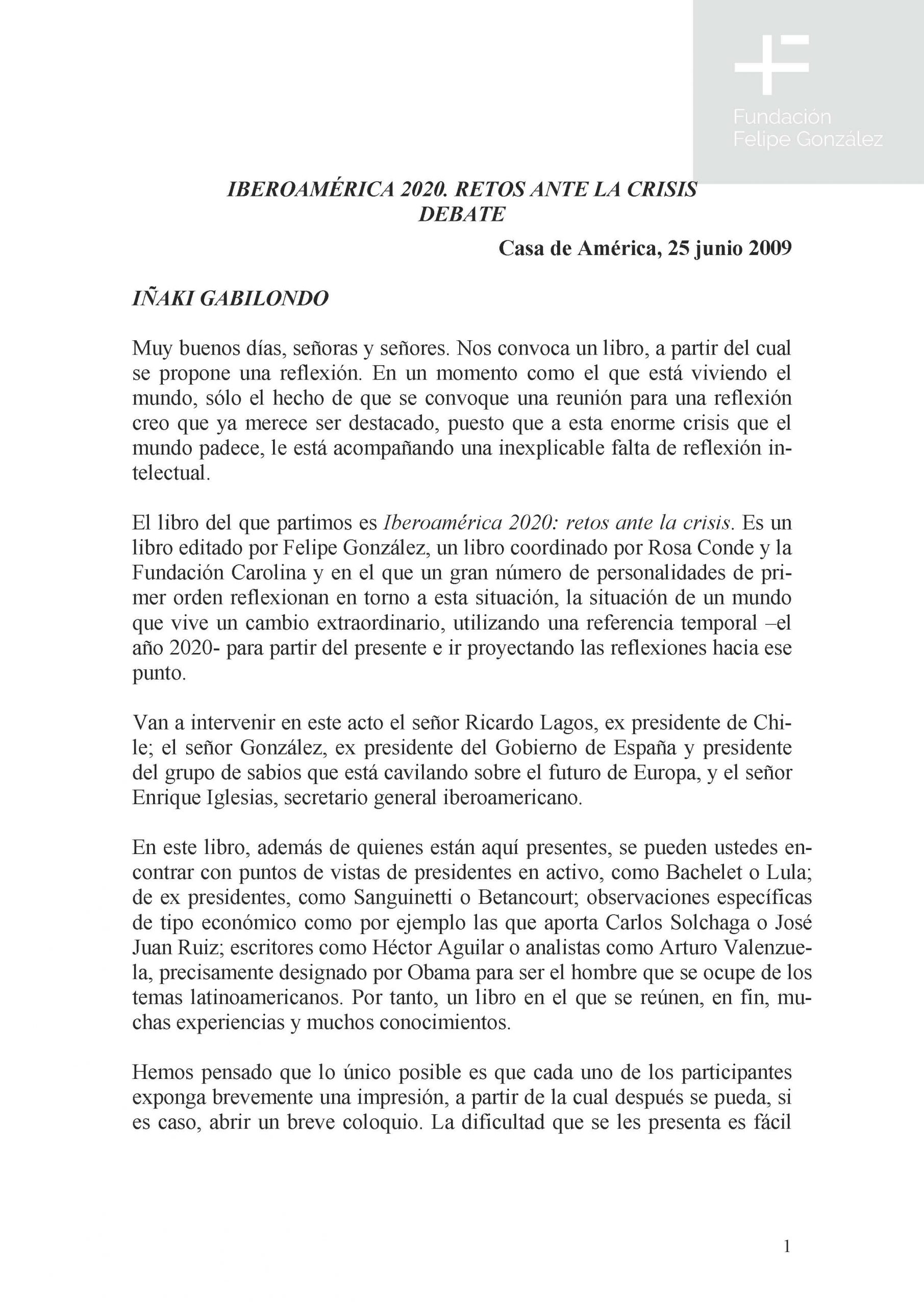 La estructura del libro se basa en una referencia temporal, el año 2020, desde la que se proyectan reflexiones sobre el presente y el futuro de Iberoamérica. El expresidente español destaca la importancia del libro al abordar una crisis mundial sin precedentes, la cual “pone de manifiesto que la mano invisible del mercado no regula su propio funcionamiento.” Enrique Iglesias resalta el impacto de la crisis sobre el proceso de globalización y su capacidad de cuestionar el modelo económico internacional, e insiste en que algunos países podrían evitar la recesión gracias a una mejor gestión macroeconómica. En cuanto al futuro, advierte que requiere una combinación de crecimiento económico y equidad social.