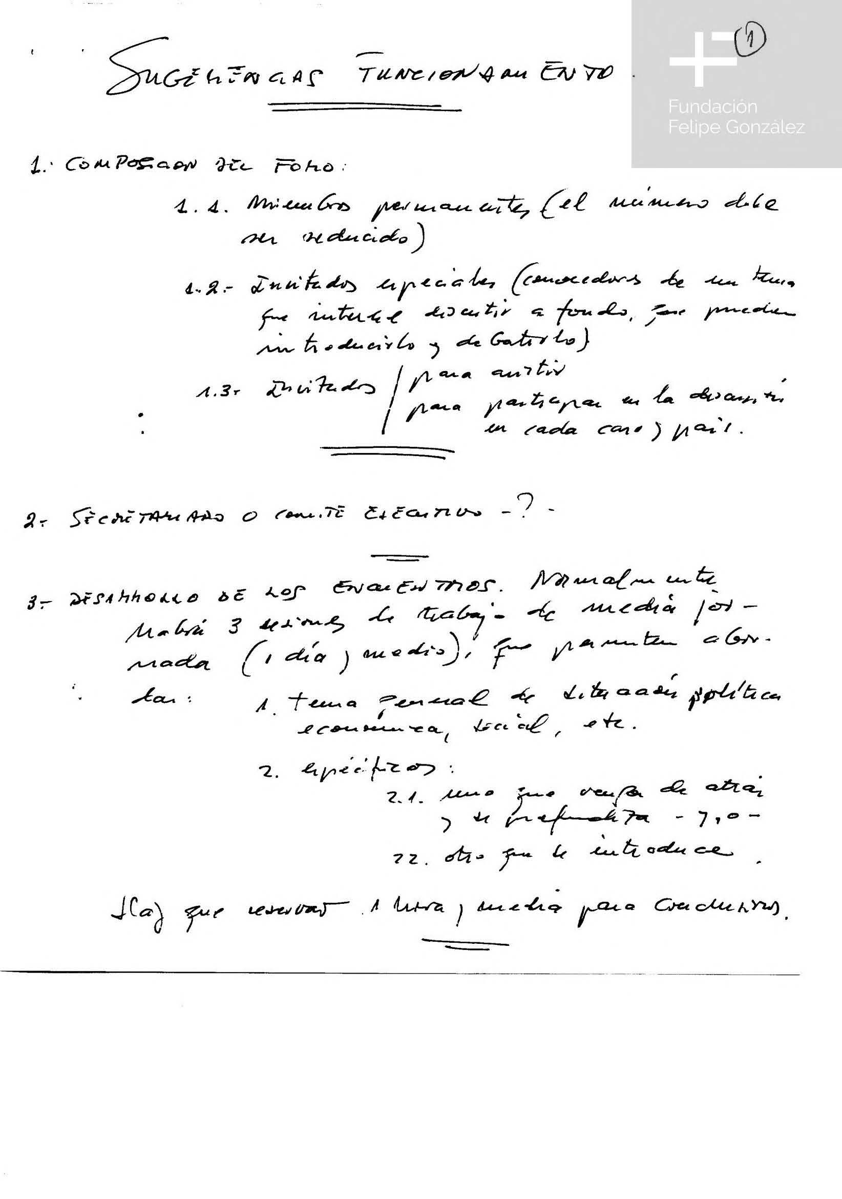 La capital argentina de Buenos Aires recoge la segunda reunión del Foro Iberoamérica los días 8 y 9 de noviembre de 2001, a la que acude el expresidente Felipe González, que toma notas respecto al funcionamiento del foro. Divide sus sugerencias en tres grandes puntos: la composición de este, la opción de que haya un secretariado o un comité ejecutivo, y el desarrollo de los encuentros, además de anotar cómo cree que se puede desarrollar.