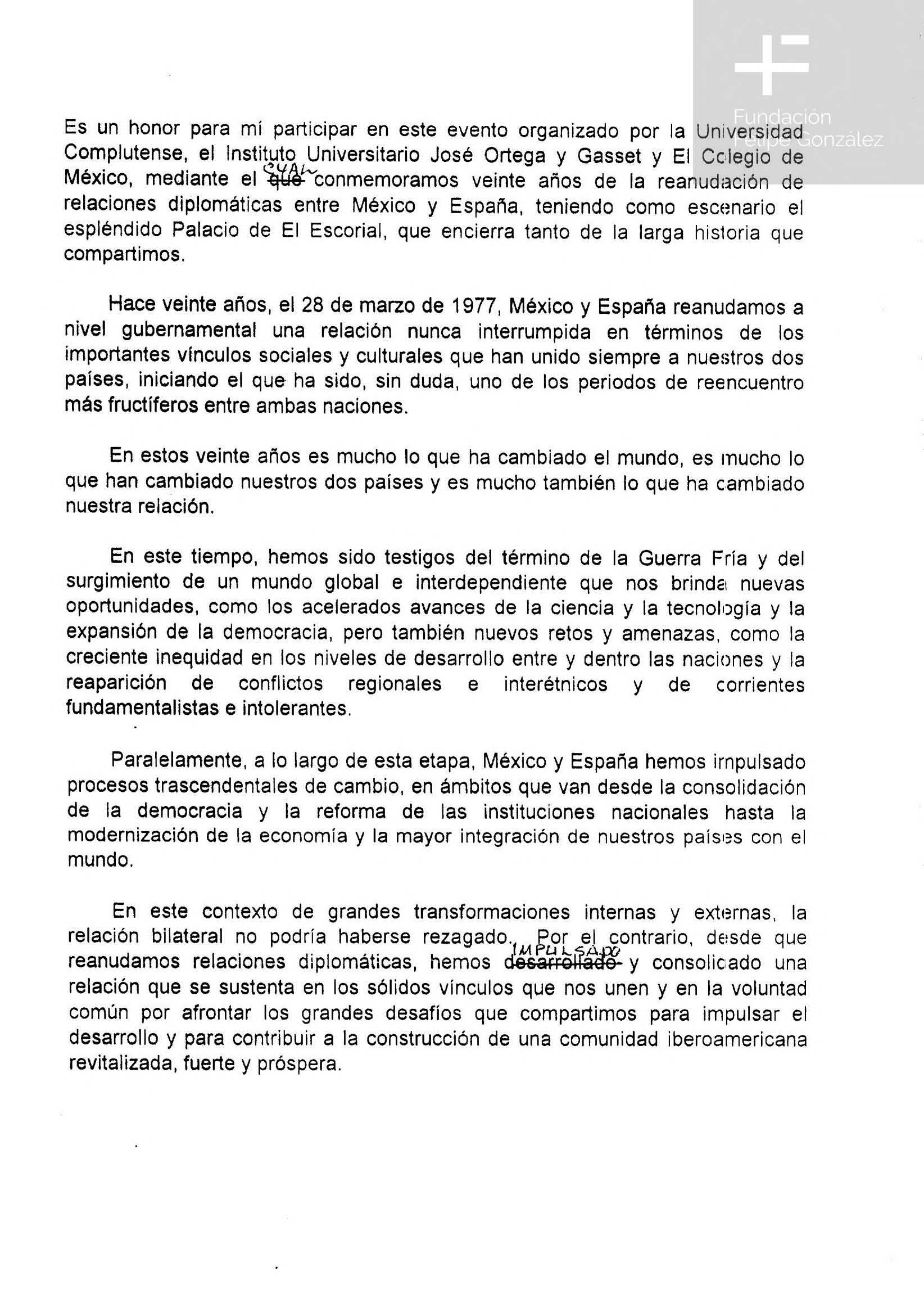Miguel de la Madrid, expresidente de México entre 1982 y 1988, acude al evento organizado por la Universidad Complutense, el Instituto José Ortega y Gasset y el Colegio de México por el XX Aniversario de la reanudación de las relaciones diplomáticas entre México y España. Es en marzo de 1977 cuando se reanudan las relaciones diplomáticas entre ambos países si bien el expresidente señala que la relación México-España nunca había sido “interrumpida en términos de los importantes vínculos sociales y culturales que han unido siempre a nuestros dos países”.