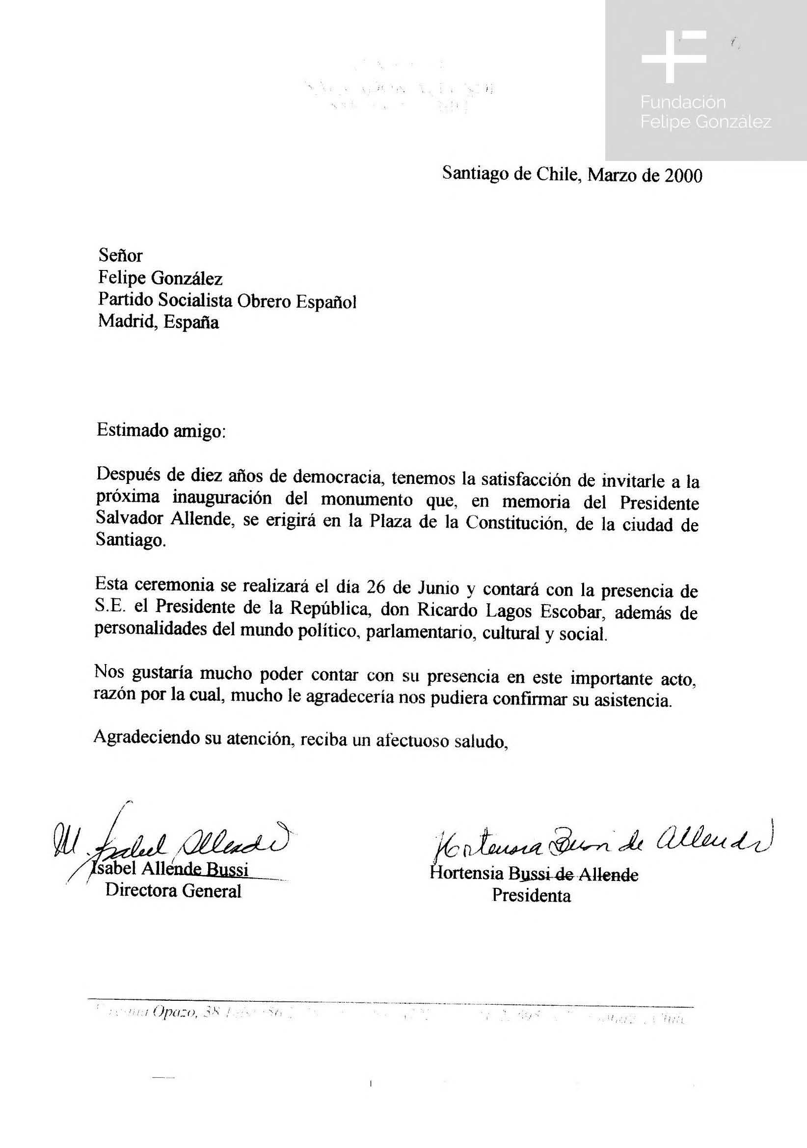 Isabel Allende y Hortensia Bussi, hija y esposa del presidente Salvador Allende, invitan a Felipe González a acudir a la ceremonia de inauguración del monumento erigido en la céntrica Plaza de la Constitución de Santiago de Chile, frente al Palacio de La Moneda. La obra, creada por el escultor Arturo Hevia, es una estatua de tres metros y medio de altura que representa a Allende de pie, con sus características gafas de pasta, la banda presidencial y envuelto por la bandera. Su pie izquierdo adelantado simboliza su determinación. En el pedestal, esculpida en piedra, se encuentra una frase del último mensaje que dirige al pueblo chileno el 11 de septiembre de 1973, en pleno golpe de Estado, a través de Radio Magallanes: “Tengo fe en Chile y su destino”.