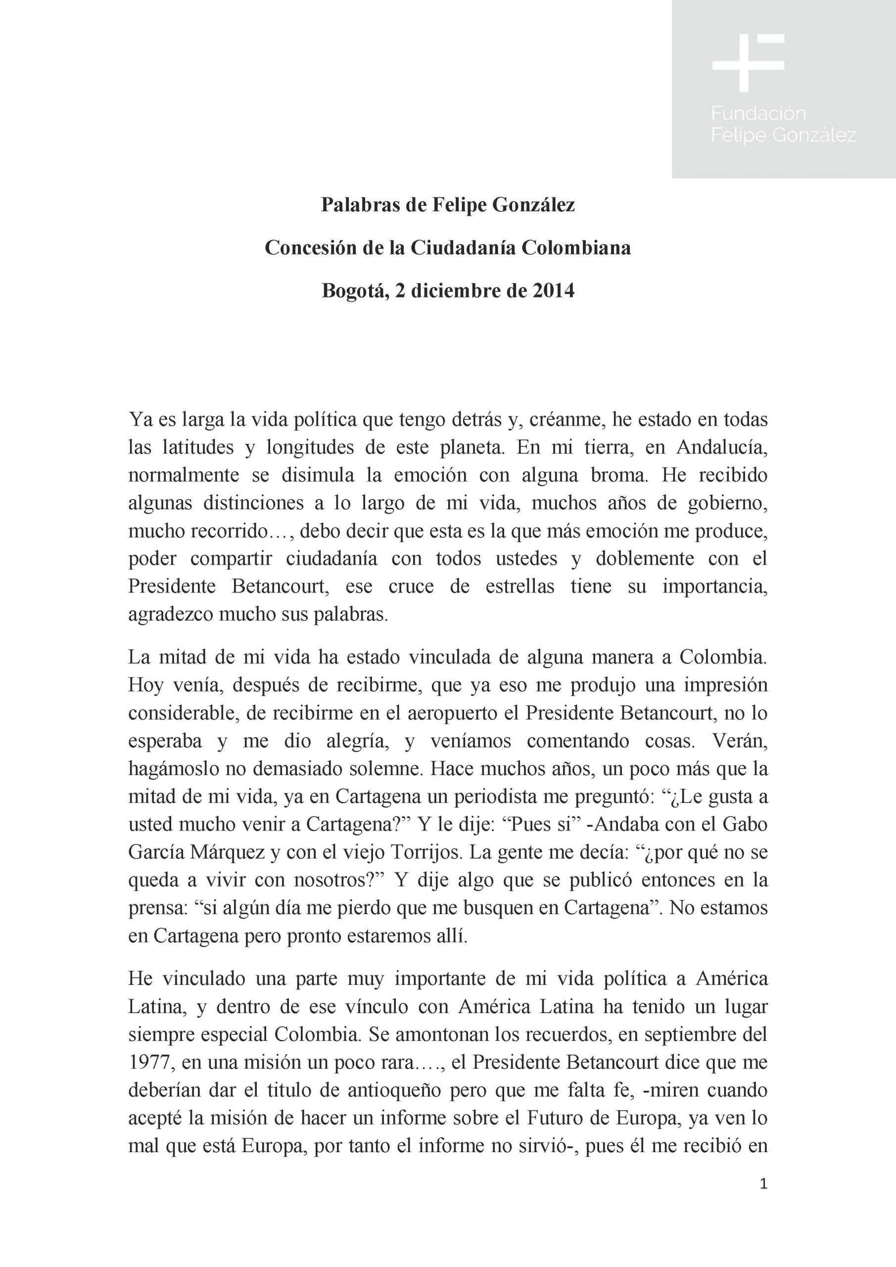 En este acto se refleja el agradecimiento del pueblo colombiano por la labor que Felipe González, a lo largo de las últimas décadas, desarrolla en favor del proceso de paz que culmina en 2016 con la firma del Acuerdo Final para la Terminación del Conflicto y la Construcción de una Paz Estable y Duradera. El expresidente reconoce la voluntad de todos los mandatarios colombianos que ha conocido para poner fin a la violencia endémica y celebra haberles acompañado en ese proceso. González cierra su intervención agradeciendo al presidente Santos la entrega de la ciudadanía colombiana, a la que describe como “una gran distinción” y que refuerza su identidad al sentirse “tan colombiano como español y tan español como colombiano.”