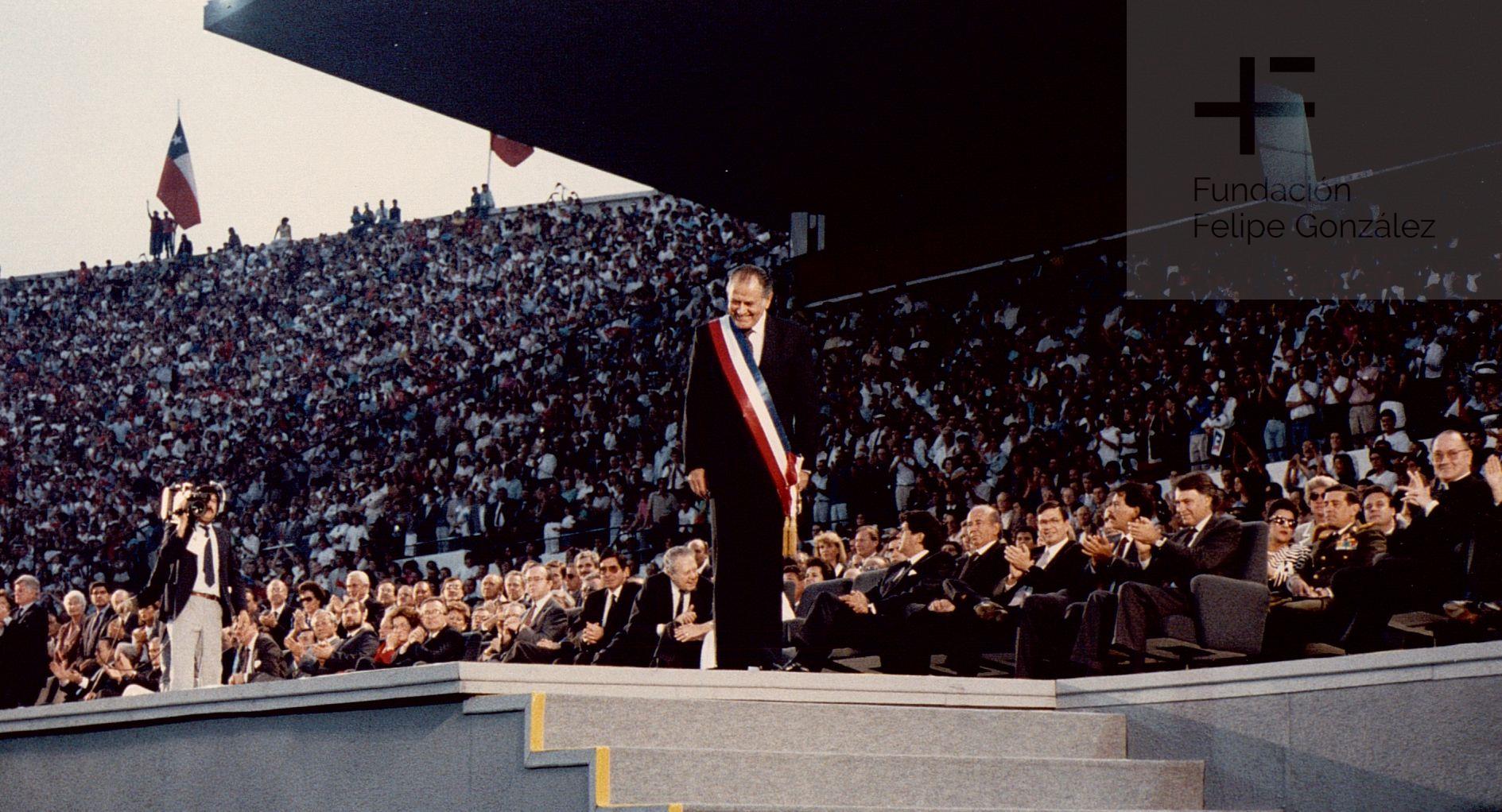 En la fotografía, podemos ver al recién nombrado presidente de Chile durante el acto celebrado el 12 de marzo en el Estadio Nacional de Santiago, bajo el lema “Así me gusta Chile”. A este evento asistieron más de setenta mil personas, junto con todas las delegaciones extranjeras que se habían negado a participar en la ceremonia celebrada un día antes, en la que el general Pinochet entrega la banda presidencial al presidente Aylwin. El acto en el Estadio Nacional busca escenificar el reencuentro del pueblo chileno con la democracia afirmando el compromiso con la nueva etapa que comienza. En su intervención, el presidente Aylwin expresa: “En este momento crucial de nuestra vida nacional, invito a todos y a cada uno de mis compatriotas a preguntarse, mirando al fondo de su conciencia, de qué manera cada uno puede contribuir a la gran tarea común y a disponerse a asumir su cuota de responsabilidad.