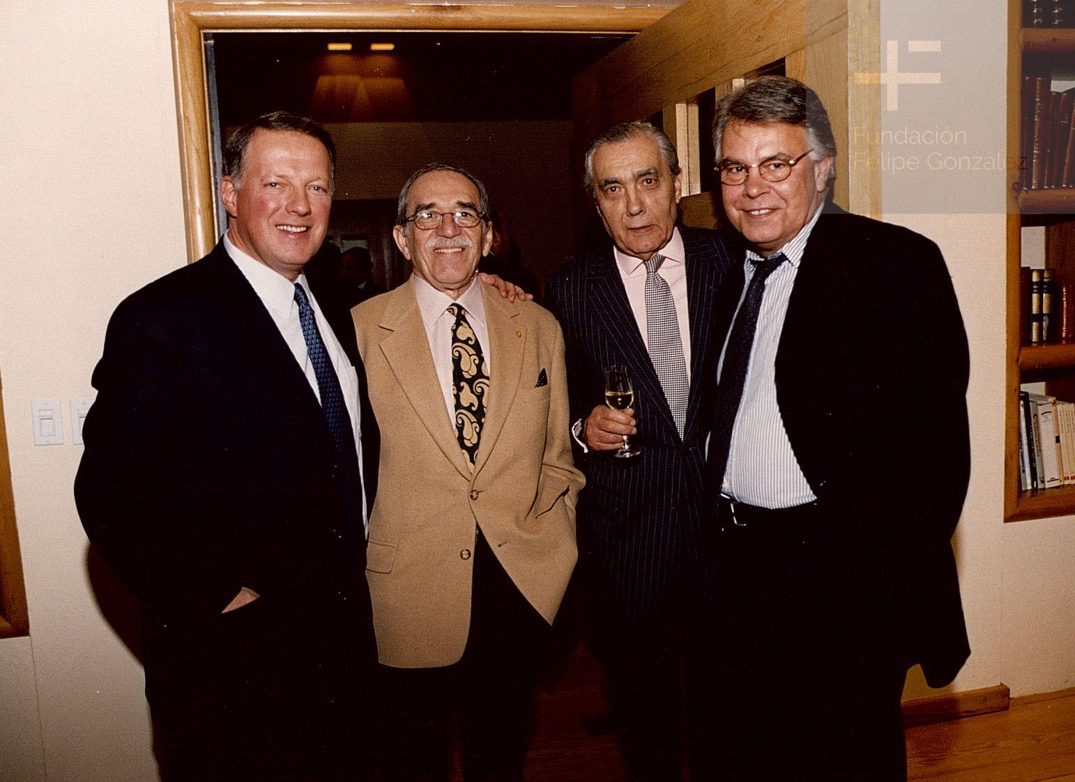 El expresidente Felipe González posa junto al escritor Gabriel García Márquez en una foto de grupo tomada durante la XIV Feria de Fráncfort y la más importante del mundo hispanohablante. Bajo el lema de «El camino a la cultura«, esta edición tiene a España como país invitado por primera vez, prueba tangible de los profundos lazos culturales en común entre ambos países.